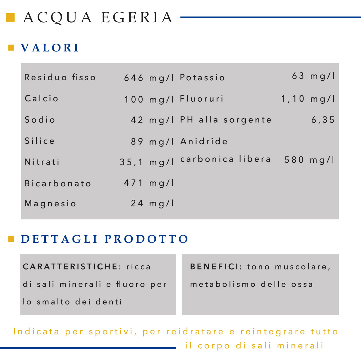 L’equilibrio perfetto dell’Acqua Egeria fa si che è ideale per un consumo quotidiano in famiglia o in ufficio grazie alla sua effervescenza. È consigliata per la salute e l'ambiente grazie al materiale ecologico con la quale viene venduta.