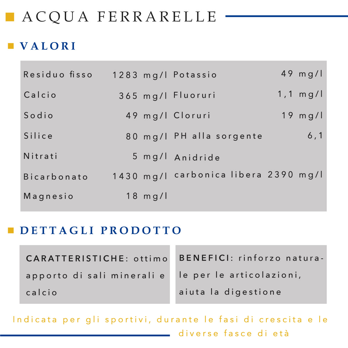 Acqua Minerale Ferrarelle è una grande alleata dell’organismo grazie alla sua particolare composizione ricca di minerali che dalle rocce carbonatiche del vulcano spento di Roccamonfina, in provincia di Caserta riceve calcio, magnesio e bicarbonato, mentre le vulcaniche l'arricchiscono di sodio, potassio, fluoruro di silice. Infine, l'anidride carbonica si unisce all'acqua regalandole la sua inconfondibile effervescenza naturale.
