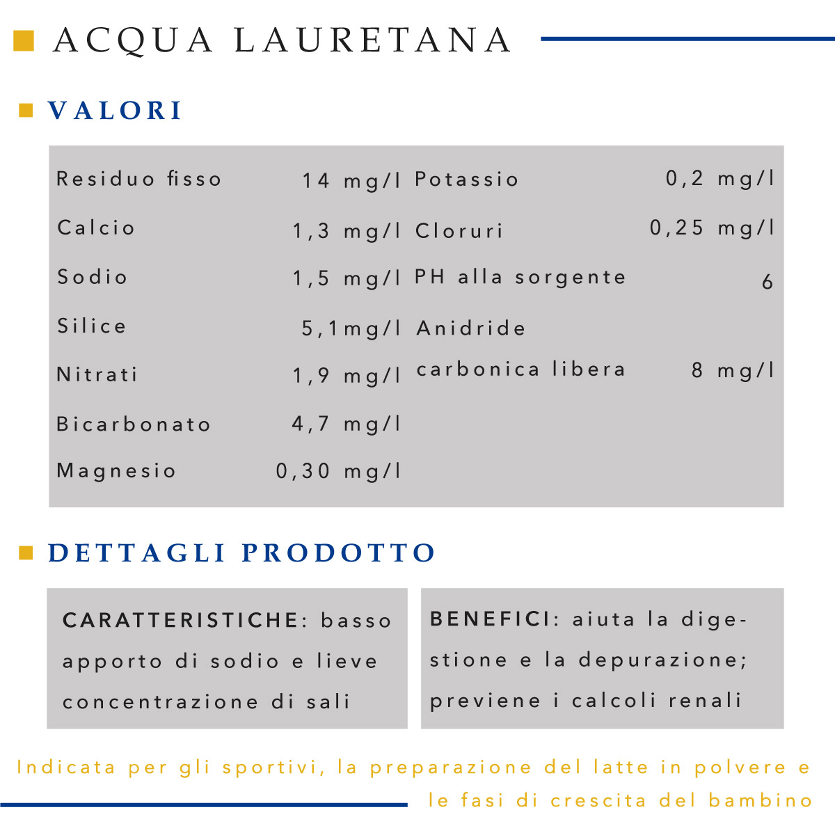 L' Acqua Lauretana è un'acqua eccellente se cerchi un prodotto leggero, che stimoli la diuresi e sia povero di sodio.È ideale per un consumo quotidiano in famiglia grazie alla sua eccellente naturalezza e purezza. È consigliata per la salute e l'ambiente grazie al materiale ecologico con la quale viene venduta.