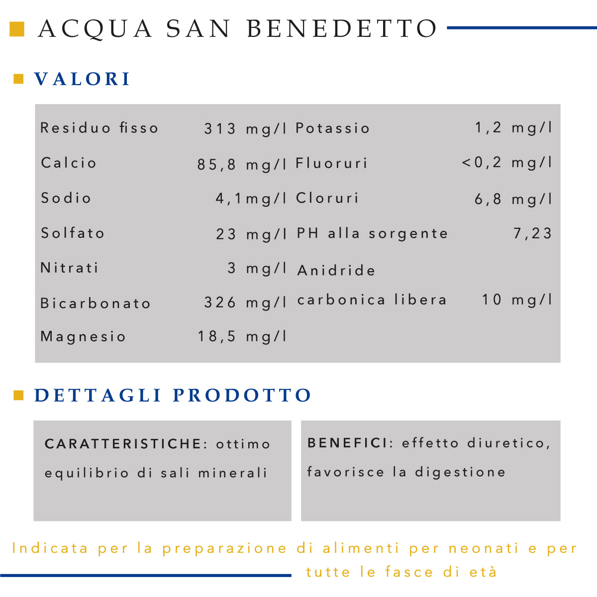 L’equilibrio perfetto dell’Acqua San Benedetto, ideale per il consumo quotidiano in famiglia o in ufficio.