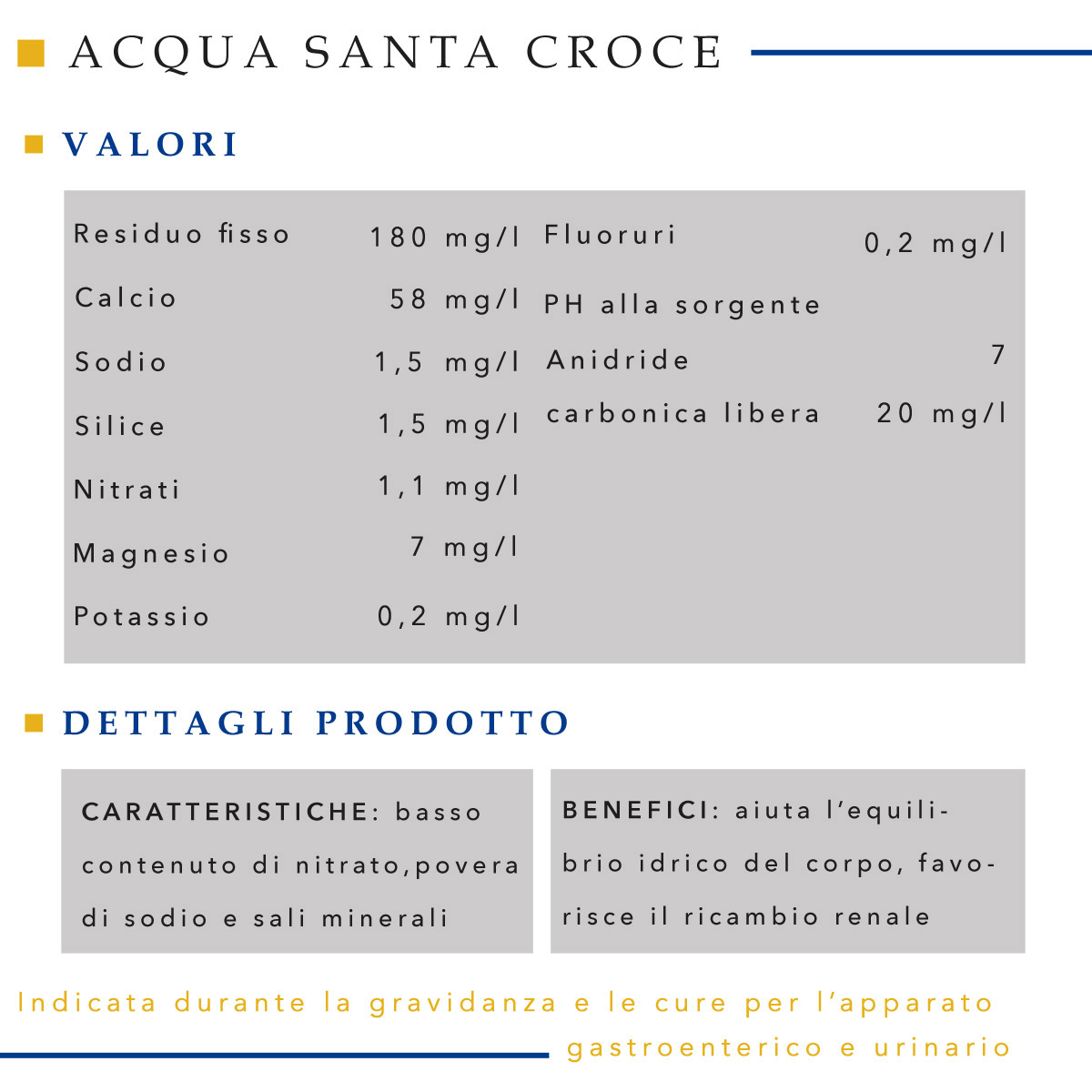 L’equilibrio perfetto dell’Acqua Santa Croce fa si che è ideale per un consumo quotidiano in famiglia o in ufficio grazie alla sua naturalezza. È consigliata per la salute e l'ambiente grazie al materiale ecologico con la quale viene venduta.